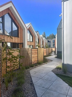 Każdy z domków ma wydzieloną prywatną strefę z tarasem do wyłącznej dyspozycji mieszkańców. W jednym domku zastosowaliśmy ułatwienia dla osób z ograniczoną sprawnością.
