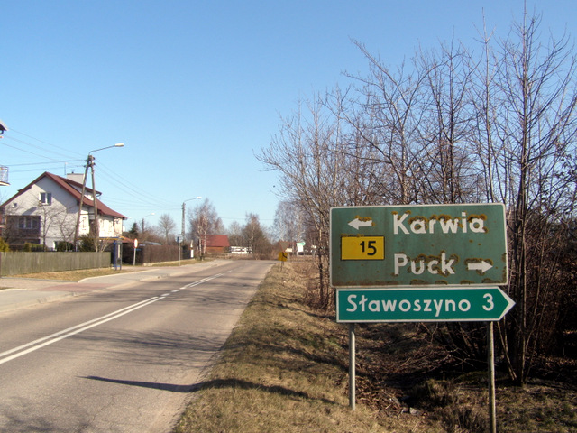 Dojeżdżamy do ronda w Krokowej. Stąd wybierając 3 zjazd, czyli w lewo możemy dojechać do Dębek - 7km lub Białogóry - 17 km. My wybieramy 1 zjazd, kierunek : Karwia - 10 km , Jastrzębia Góra 15 km.